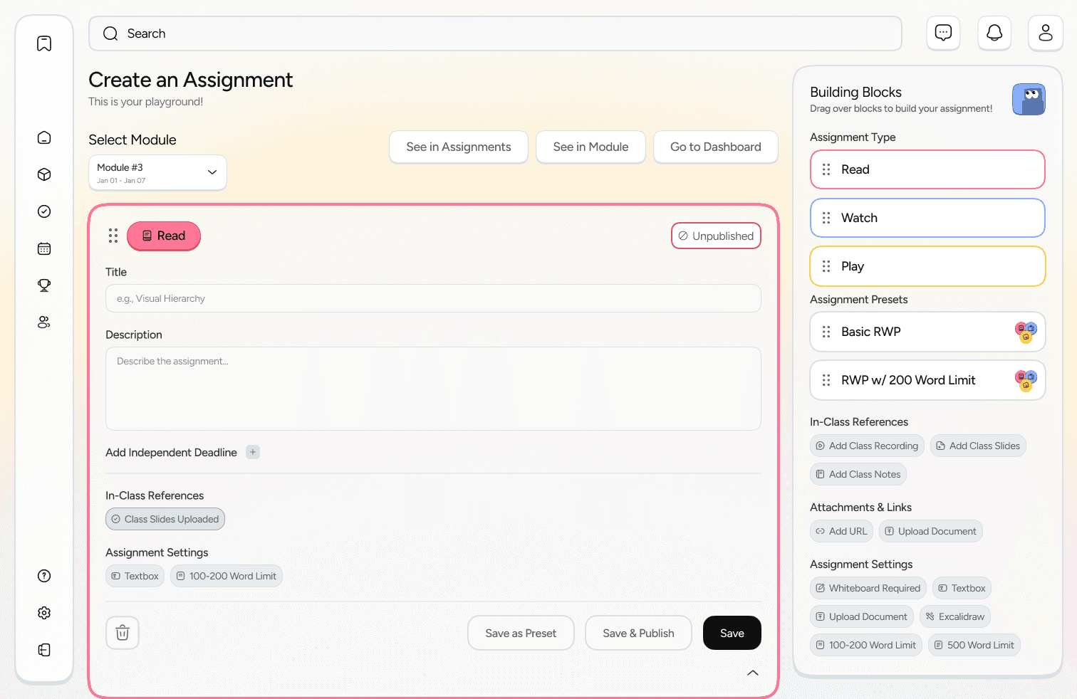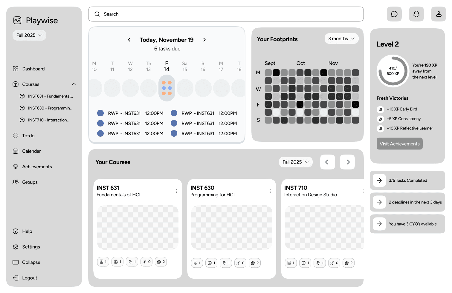 Playwise is a TLMS designed around the Read–Watch–Play pedagogy to support instructors and students in structuring and engaging with course content. When I joined the project, foundational research and early direction were already established. I focused on refining the scope, advancing the product through design system refinement, high-fidelity prototyping, and collaborating with the team to prepare and launch the MVP.