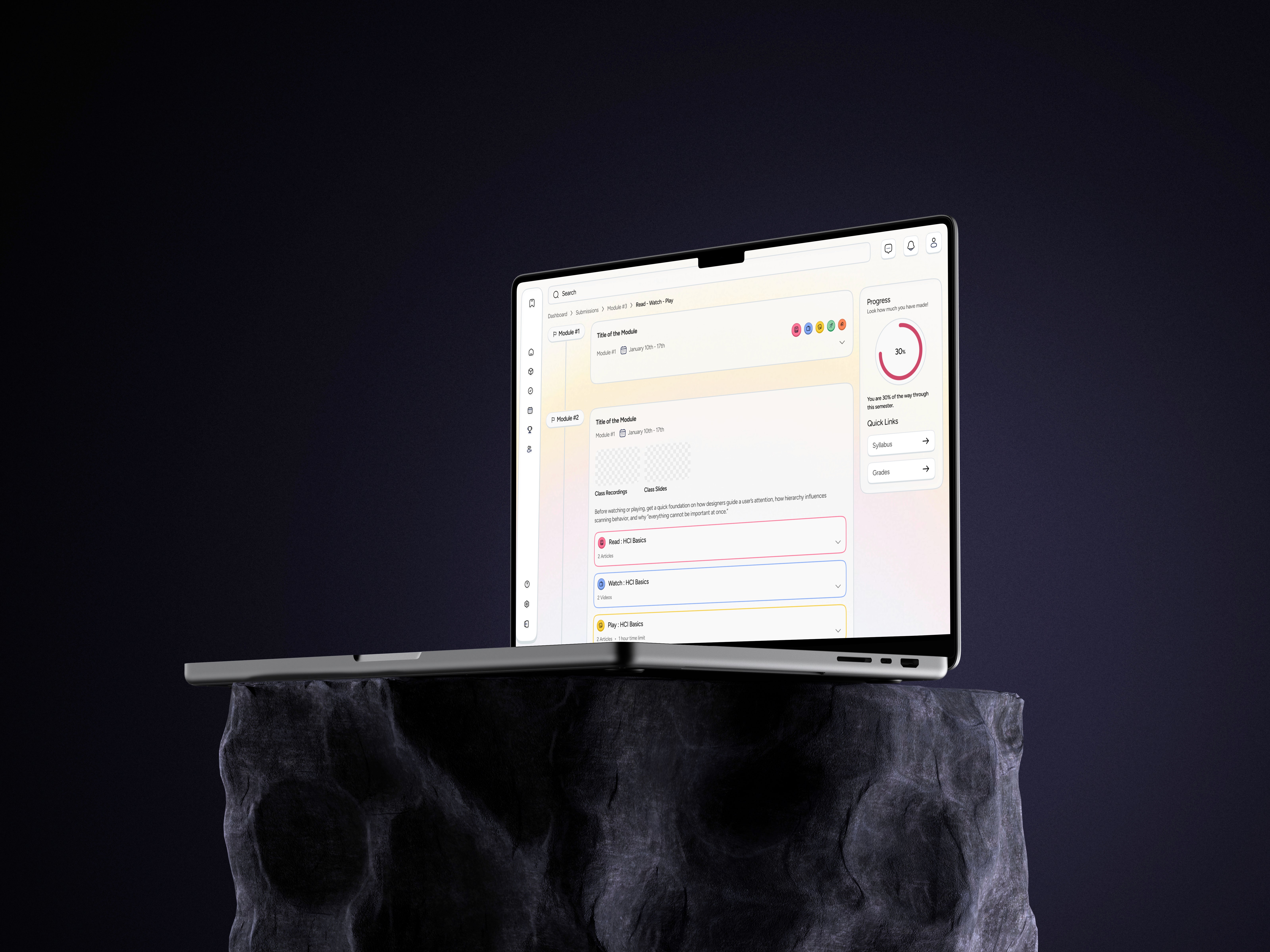 The system needed to be engaging and motivating for students through light gamification, while remaining clearly structured to help instructors understand and apply the Read–Watch–Play pedagogy when creating course content.